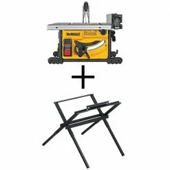 Maximized for accuracy and capacity this 8-1/4 in. table saw includes on-board storage for blade guard assembly, non-through cut riving knife, anti-kickback pawls, blade change wrenches, miter gauge and push stick. The powerful DEWALT 15 Amp, 5800 RPM motor allows users to complete a majority of applications. The rack and pinion fence allow for fast, easy adjustments and provides the capacity to rip 4×8 sheet goods. For a limited time get a bonus Compact Table Saw Stand with purchase.