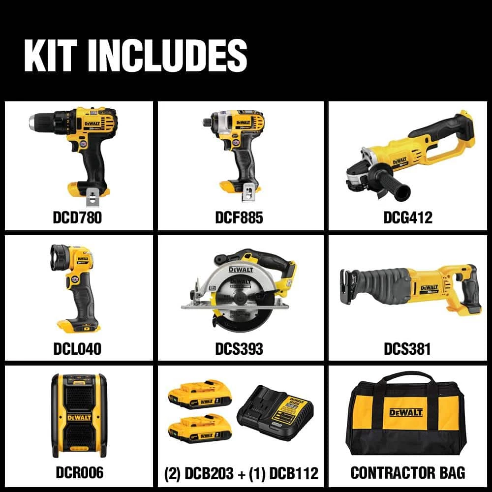 Get the cutting, grinding and fastening applications finished faster and easier with the DEWALT DCK720D2 Power Tool Combo Kit. Perfect for the job site or at home, this power tool combo set features a cordless drill driver, impact driver, reciprocating saw, circular saw, grinder, jobsite Bluetooth speaker, and LED work light. The DCK720D2 Power Tool Combo Kit is backed by a DEWALT 3-year limited warranty for added peace of mind.
