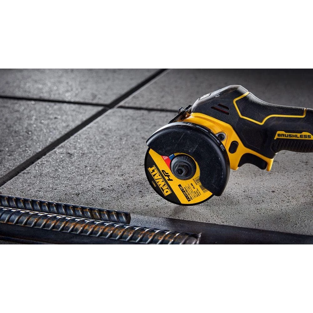 Cut a wide range of tough materials with the 20V MAX* XR (R) Brushless 3 in. Cut-Off Tool. With a no-load speed of 20,000 rpm, this durable tool is designed to cut through a variety of materials like metal, tile, stone, plastic, and drywall/fiber cement. You won’t waste time hunting for a hex wrench thanks to the onboard storage and spindle lock which enable quick wheel changes. With both forward and reverse capability, you can conveniently change the direction of the cut depending on the application. The included dust shroud with adjustable shoe and AirLock (TM) connection allows for convenient attachment to DEWALT extractors, while the integrated LED lets you work in dark spaces. This versatile tool is Lanyard Ready (TM) Capable to protect against drops, and is Chip-Ready to allow tracking via the TOOL CONNECT (TM) System (chip and lanyard sold separately).