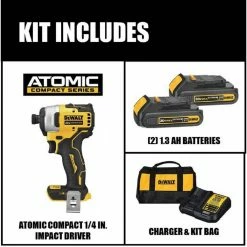 - Includes 1 DCD708B Atomic 20-Volt max compact 1/2 in. drill/driver, 1 DCF809B Atomic 20-Volt max compact 1/4 in. impact driver, (2) 20-Volt max lithium-ion 1.3 Ah battery-packs, 20-Volt max charger and contractor bag