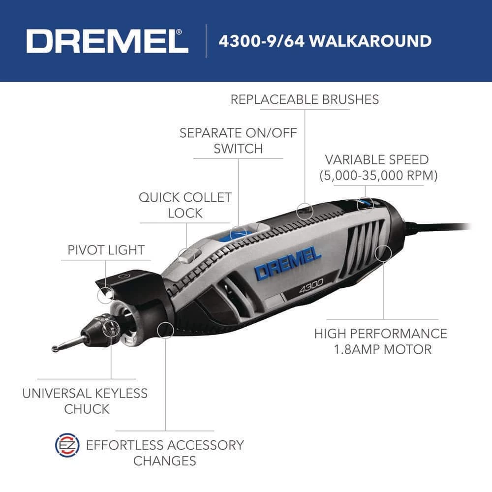 The Dremel 4300 is the first Dremel rotary tool to allow tool-less and collet-less accessory changes with the inclusion of the three-jaw chuck. The chuck accepts all Dremel accessory shank sizes for fast and convenient accessory changes without ever using a wrench. Featuring the all new Pivot Light, your projects are well-lit with an optimum line of sight since the light pivots to direct illumination where you want it. Experiencing the full range of Dremel rotary tool applications is easier than ever because the 4300 offers our most powerful motor with built-in variable speed and electronic feedback circuitry. And the slim, ergonomic body design provides a comfortable 360 degrees grip zone no matter how you hold it for extended ease of use. The completely redesigned airflow system lets the Dremel 4300 run cool, quiet and smooth so completing projects are more enjoyable than ever.