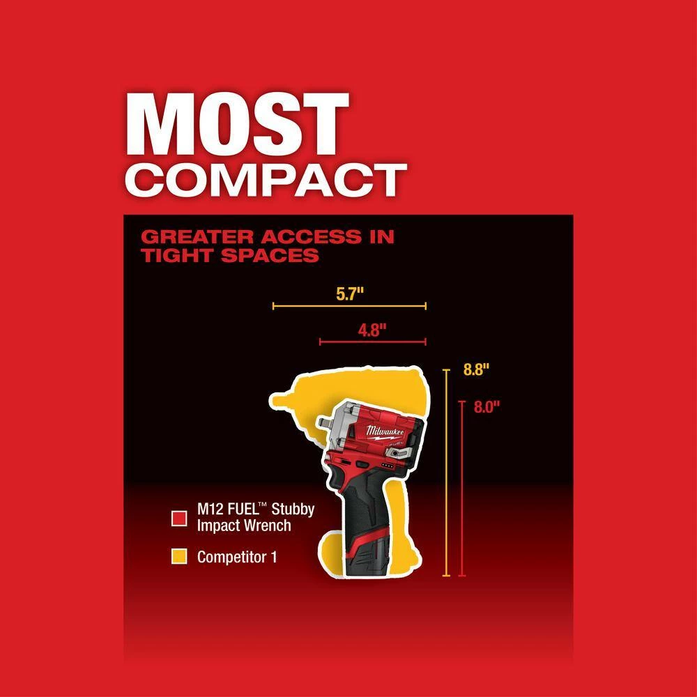 - Includes M12 FUEL stubby 3/8 in. impact wrench 2554-20, M12 4.0AH battery 48-11-2440, M12 2.0AH battery 48-11-2420, M12 charger 48-59-2401, one M12 service and repair flood light with USB charging 2367-20 and bag