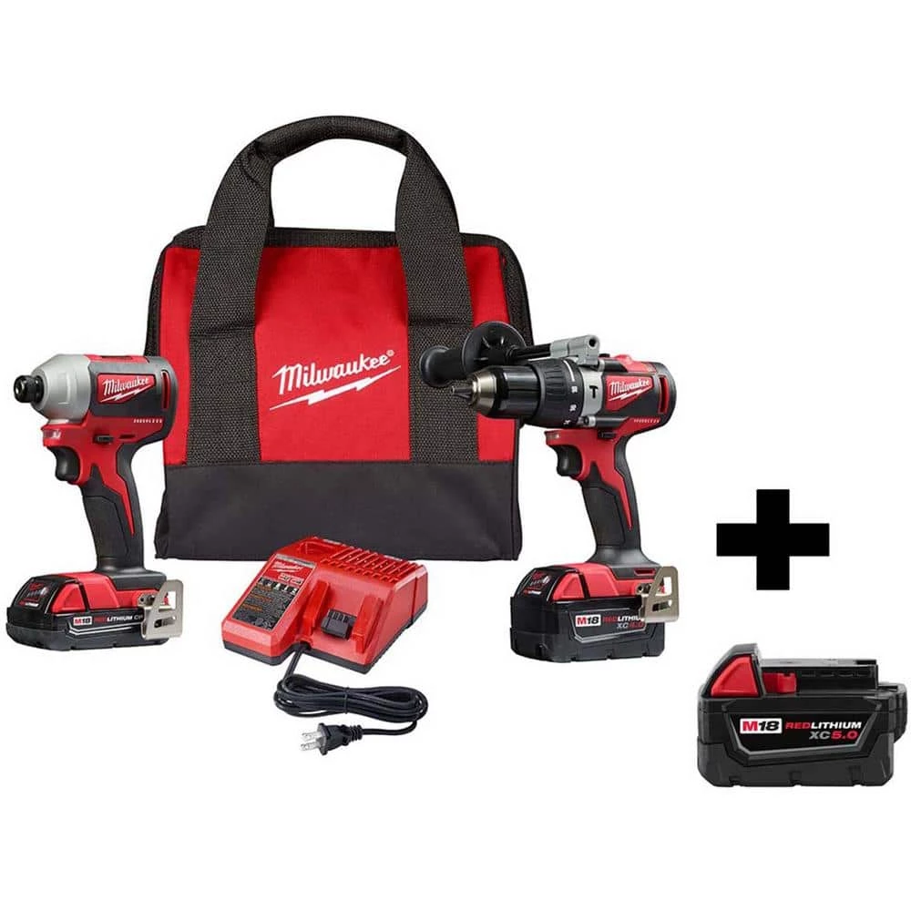 - Includes: 2902-20 hammer drill driver, 2850-20 impact driver, (1) M18 compact REDLITHIUM 2.0Ah battery (48-11-1815), (1) M18 REDLITHIUM 4.0Ah XC extended capacity battery (48-11-1840), (1) M18 and M12 multi-voltage charger (48-59-1812), (1) belt clip, (1) contractor bag and (1) free M18 5.0Ah battery (48-11-1850)