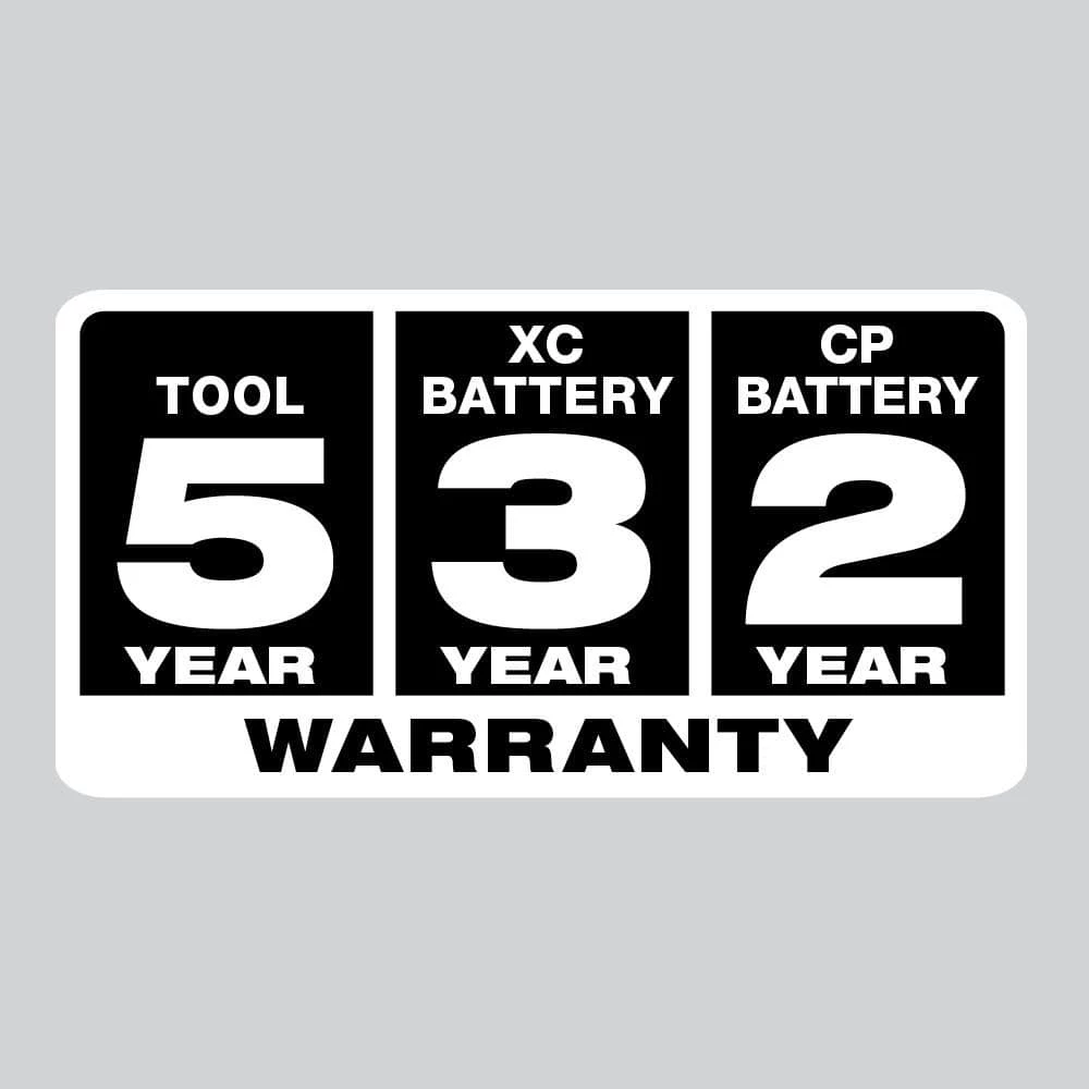 - 5-year warranty on tools, 3-year warranty on XC batteries, 2-year limited warranty on CP batteries